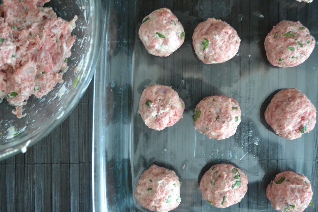 Take a large pinch of the meat mixture and form it into a 1 to 2 inch ball. Place the meatballs in the baking dish. Continue that process until all the meatballs are formed.