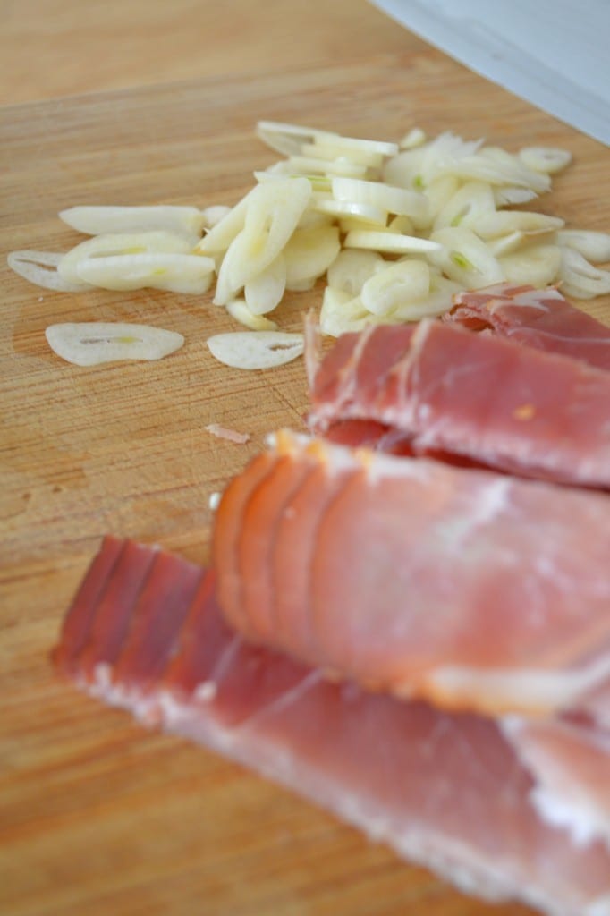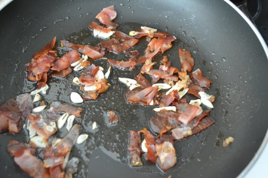 - Once the oil heats up, add the strips of prosciutto and cook until crispy, about three minutes. Add the garlic to the pan and cook for two minutes. Then turn the heat of the prosciutto pan off.