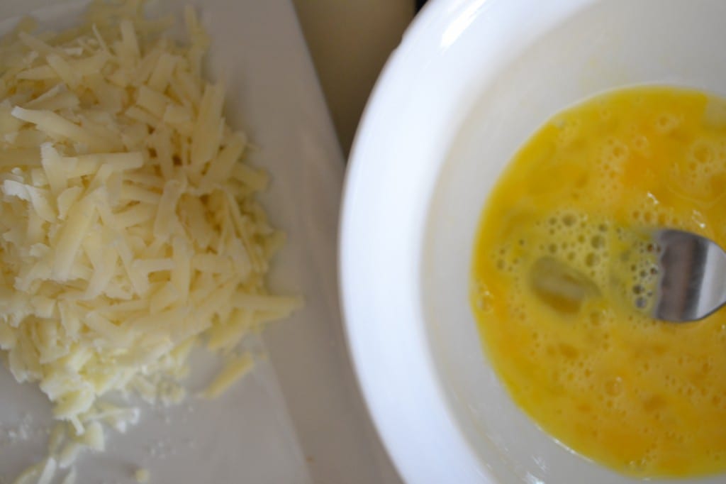 - Now here comes the sprint! Whisk together the eggs and shredded cheese. At this point turn the heat of the risotto to low. Add a ladle full of the hot stock to the eggs to temper it so the eggs do not scramble.