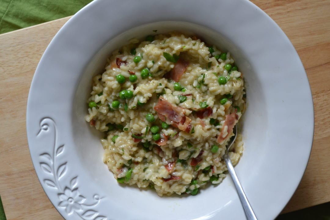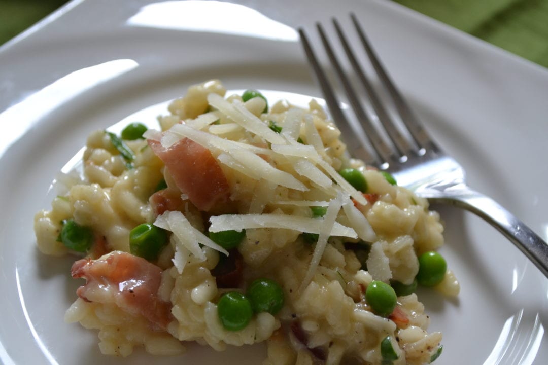 Creamy, cheesy risotto with crispy prosciutto, peas, and a bit of egg mixed into the sauce.