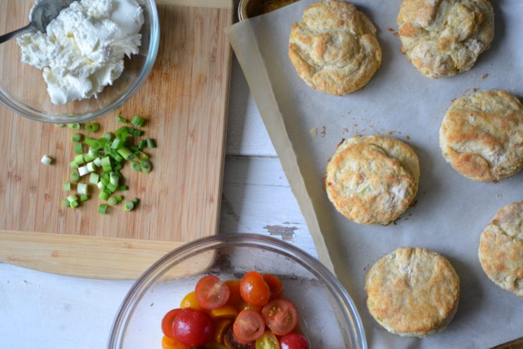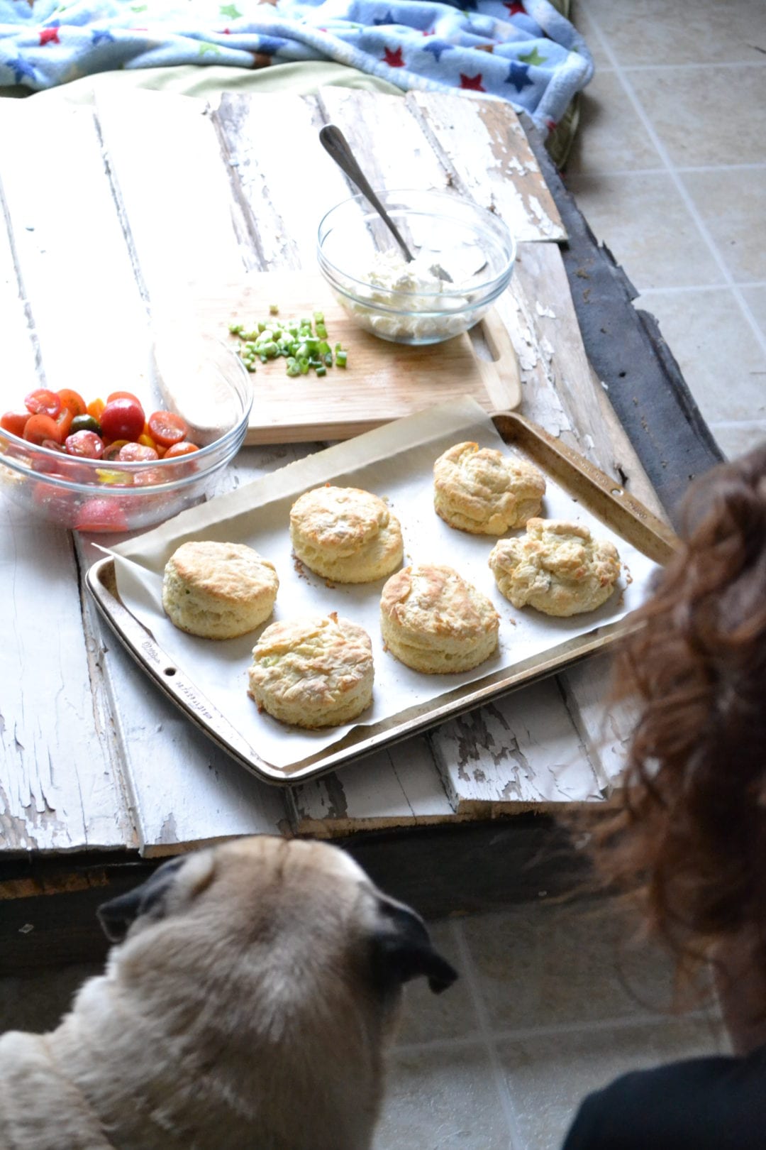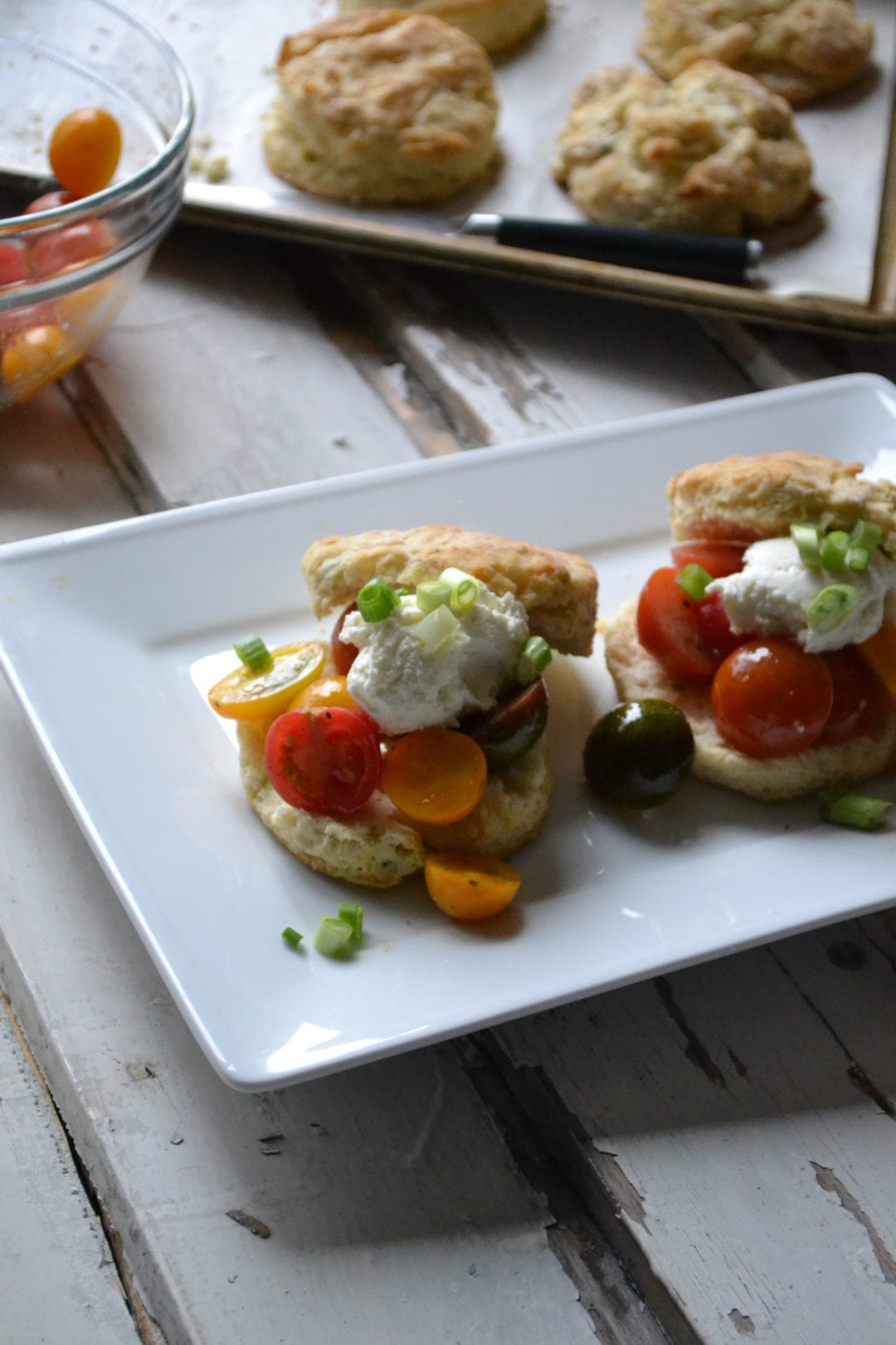 Since we both love us some goat cheese and carbs of all kind, this recipe was a natural and easy choice for us. Stephie made the shortcakes and I put together the tomato salad and whipped up (literally) the goat cheese.