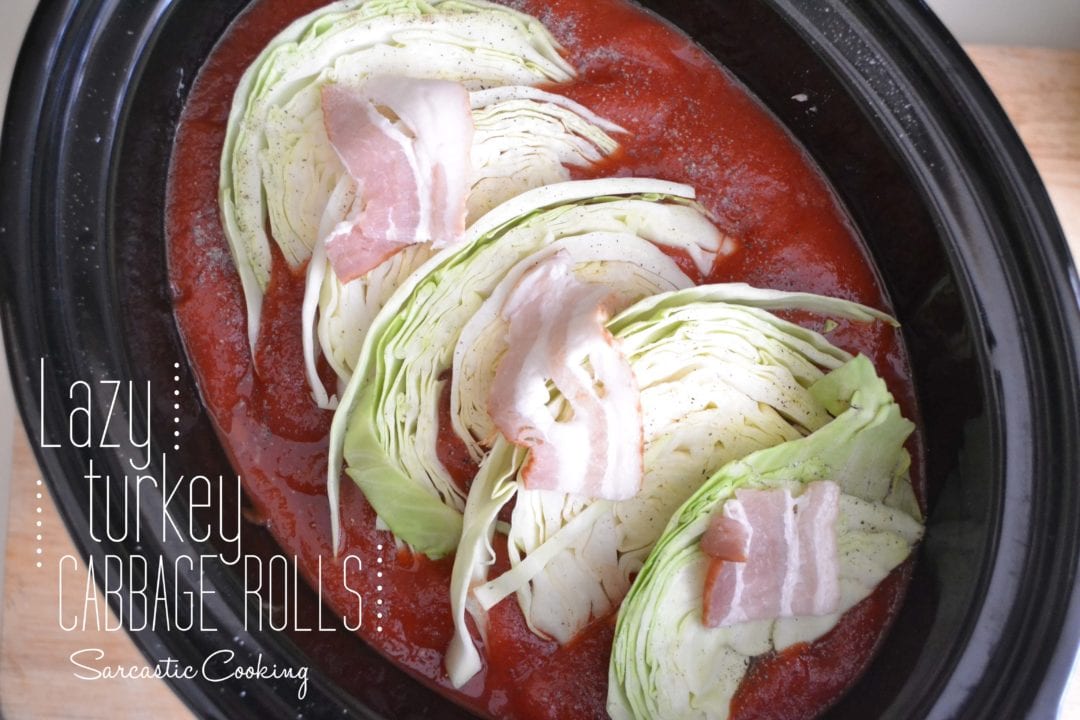 Pour another can of tomato sauce over the turkey/rice layer. Layer the remaining half of the sliced cabbage over the sauce. Gently press it into the sauce. Add the three remaining slices of bacon, if you are using it. Put the lid on and set the crockpot to low. Cook for eight hours.