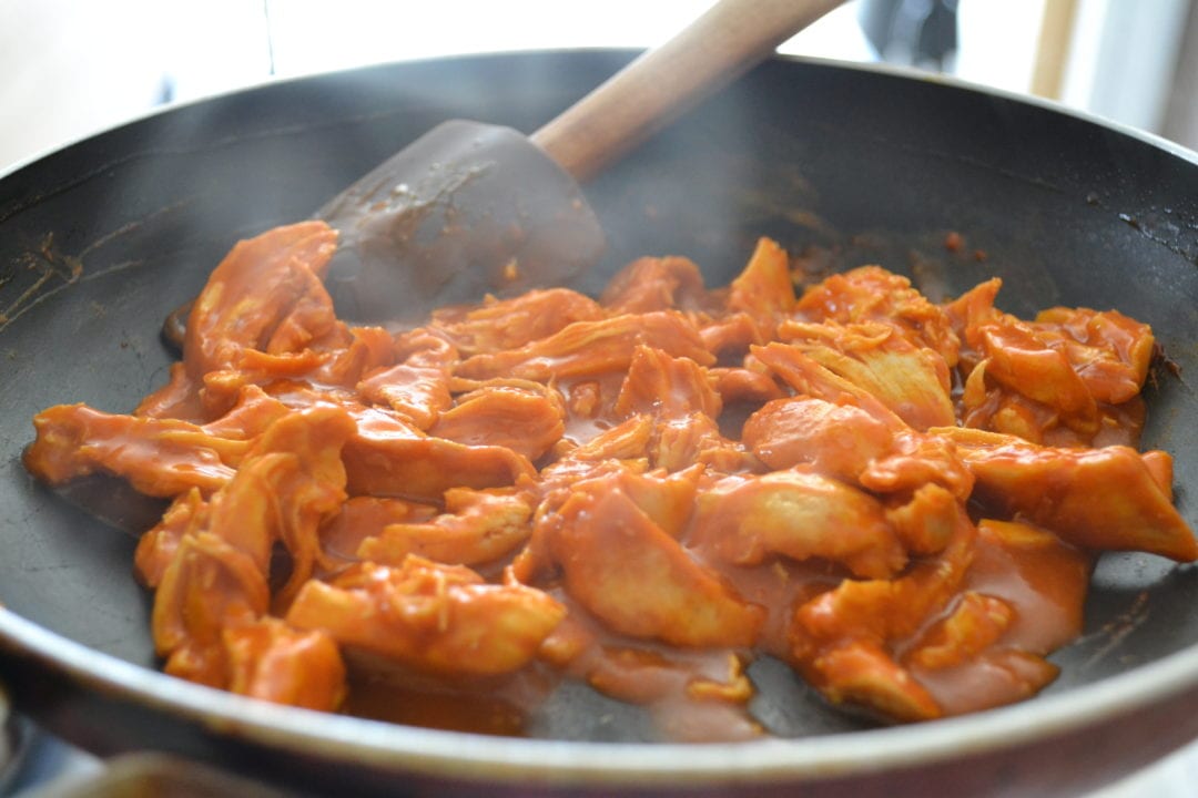 In a medium skillet, heat the olive oil for a minute or two over medium/high heat. Add the chicken breasts and cook until slightly browned on each side, about five minutes. Add the vegetable stock and cover with a lid. Cook for ten minutes. Remove the lid, shred the chicken with two forks in the pan, and then add in the buffalo sauce. Cook for another ten minutes with the lid off until the buffalo sauce has thickened up substantially. Remove from heat and set off to the side until the pizza is ready to assemble.