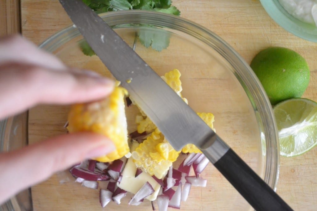 Add the butter and red onion to a medium mixing bowl. Place the cob in the center of the bowl, end down. Cut the kernels off the cob into the bowl. While the kernels are still hot mix them with the butter until it evenly coats the onion and corn.
