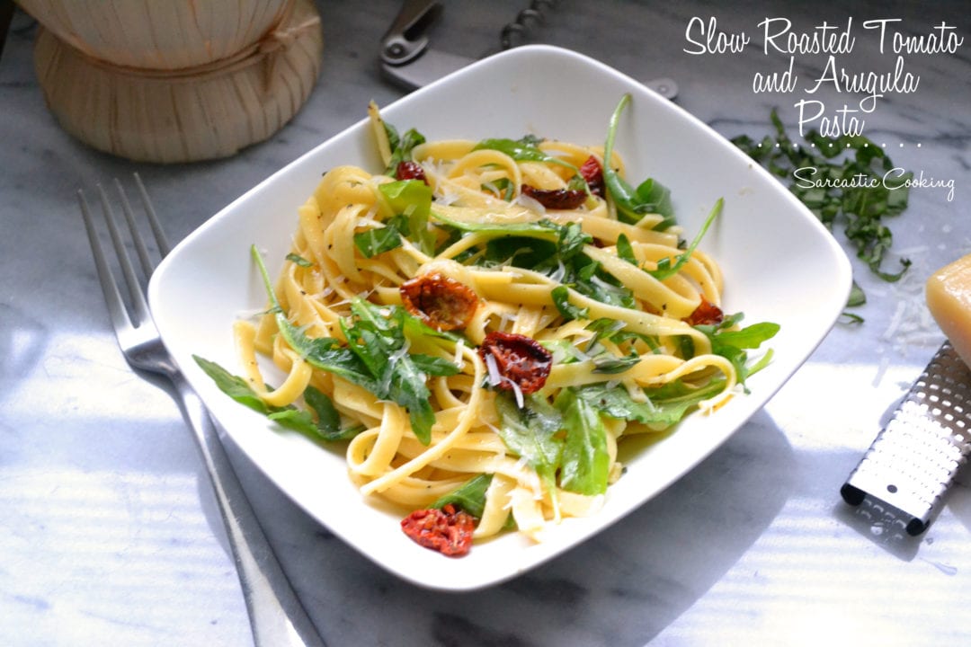 Anyway, I put the tomatoes in two hours before I need them and then forget about them. I tell Mike I am doing laundry, cleaning, or working and then proceed to watch almost the entire Netflix season of Arrested Development. Then, when the tomatoes are close to being done, I cook the pasta. No need to be picky; whatever noodle shape you have on hand will do. Add the roasted tomatoes, arugula, juice from the lemon, and a touch more olive oil. Boom! Dinner is ready to go.