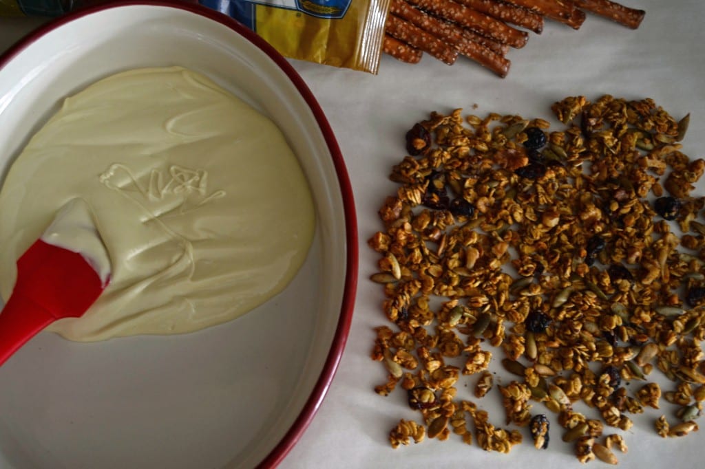 When I shared this granola recipe with you yesterday, I really had ulterior motives. I knew that I wanted to take that beautiful fiber packed healthy granola and add it to chocolate covered pretzels. I thought it was kind of genius.