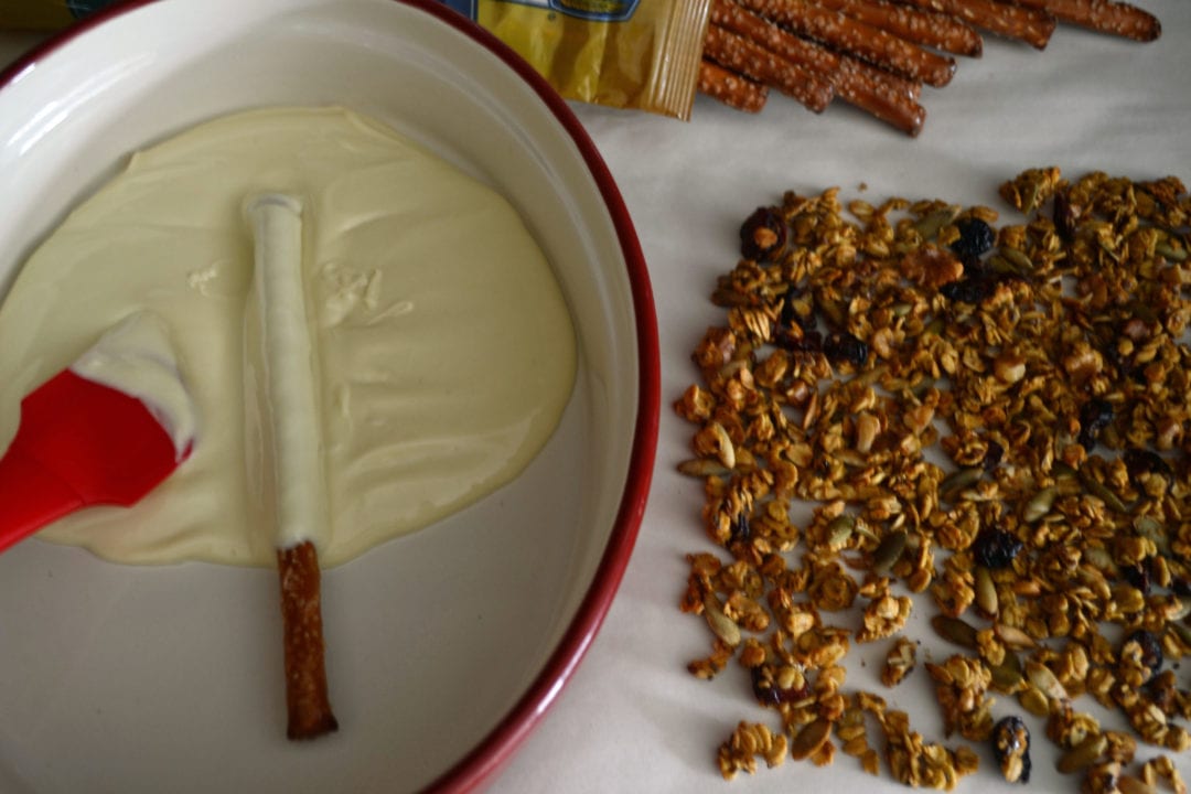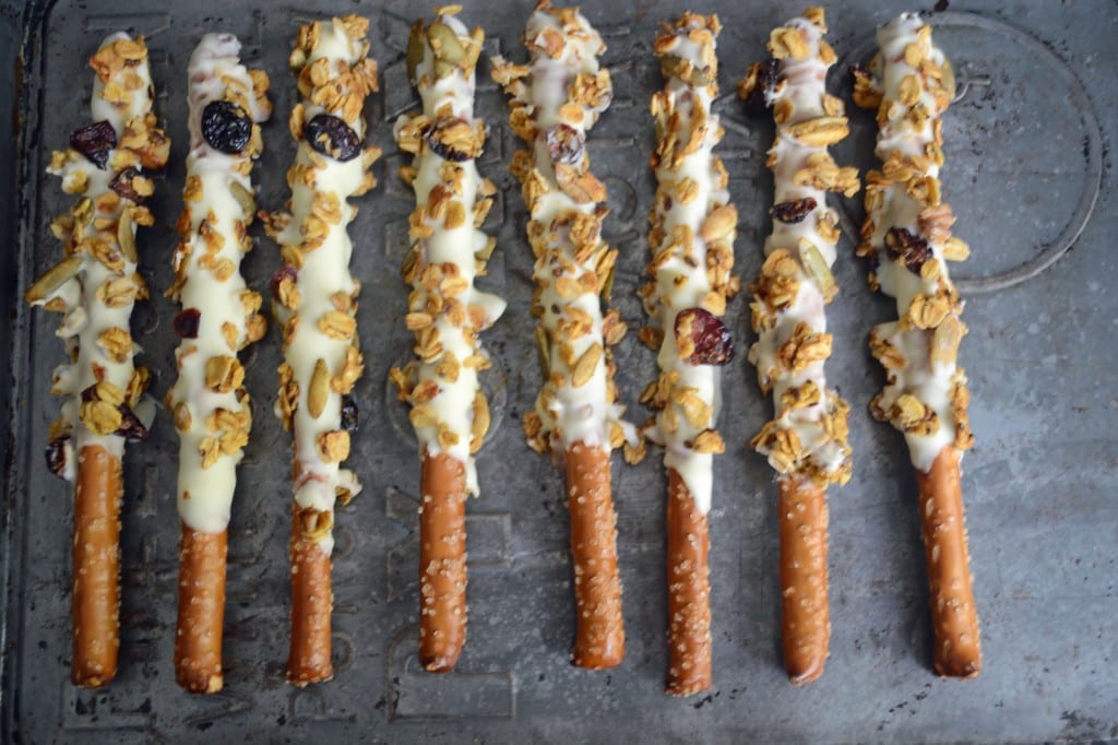 Dip the pretzel rod in the chocolate and then quickly turn and remove once it is evenly coated. Wait a good 30 seconds, then gently roll the pretzel through the granola. Don’t load it up too much or all the granola and chocolate will drip off. Place the finished dipped pretzel rod on the lined baking sheet. If it looks like there isn’t enough granola on the rod, you can always sprinkle a bit extra on top as it dries. Continue until all the chocolate is used up or you have created the desired amount of rods.
