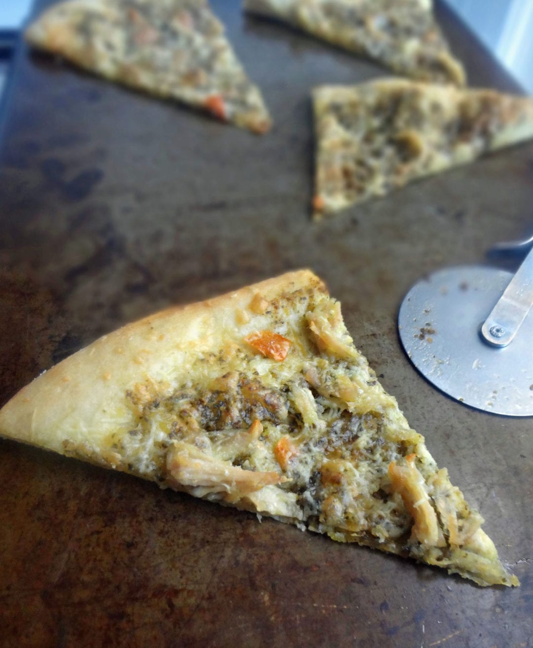 - • 1 cooked chicken breast shredded and divided between the 2 pizzas