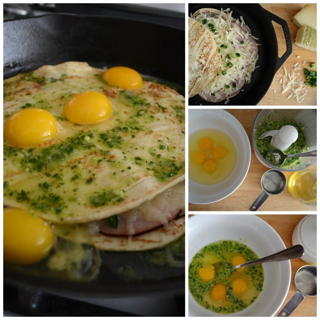 Add the eggs to a medium bowl. Gently mix in ¾ of the pesto to the whites of the eggs. Gently pour the eggs over the top of the tortilla. Try and keep all yokes on top of the tortilla, because it looks prettier. If some fall to the wayside, no worries.