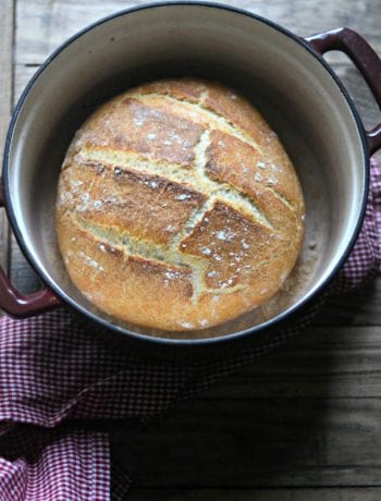 Bake the bread in the oven for 35 minutes until deeply golden. Let the bread sit for a few minutes before slicing.