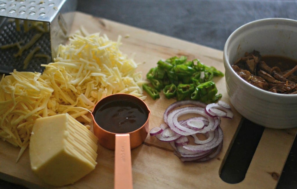 Make a layer of a few red onions, peppers, and pork. Top that with all the cheeses and then another layer of peppers, onions, and pork.