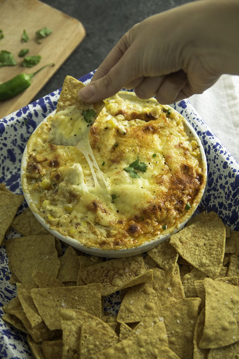 Hot corn dip made up of charred corn, bell peppers, green chiles all coated in gooey cheese.