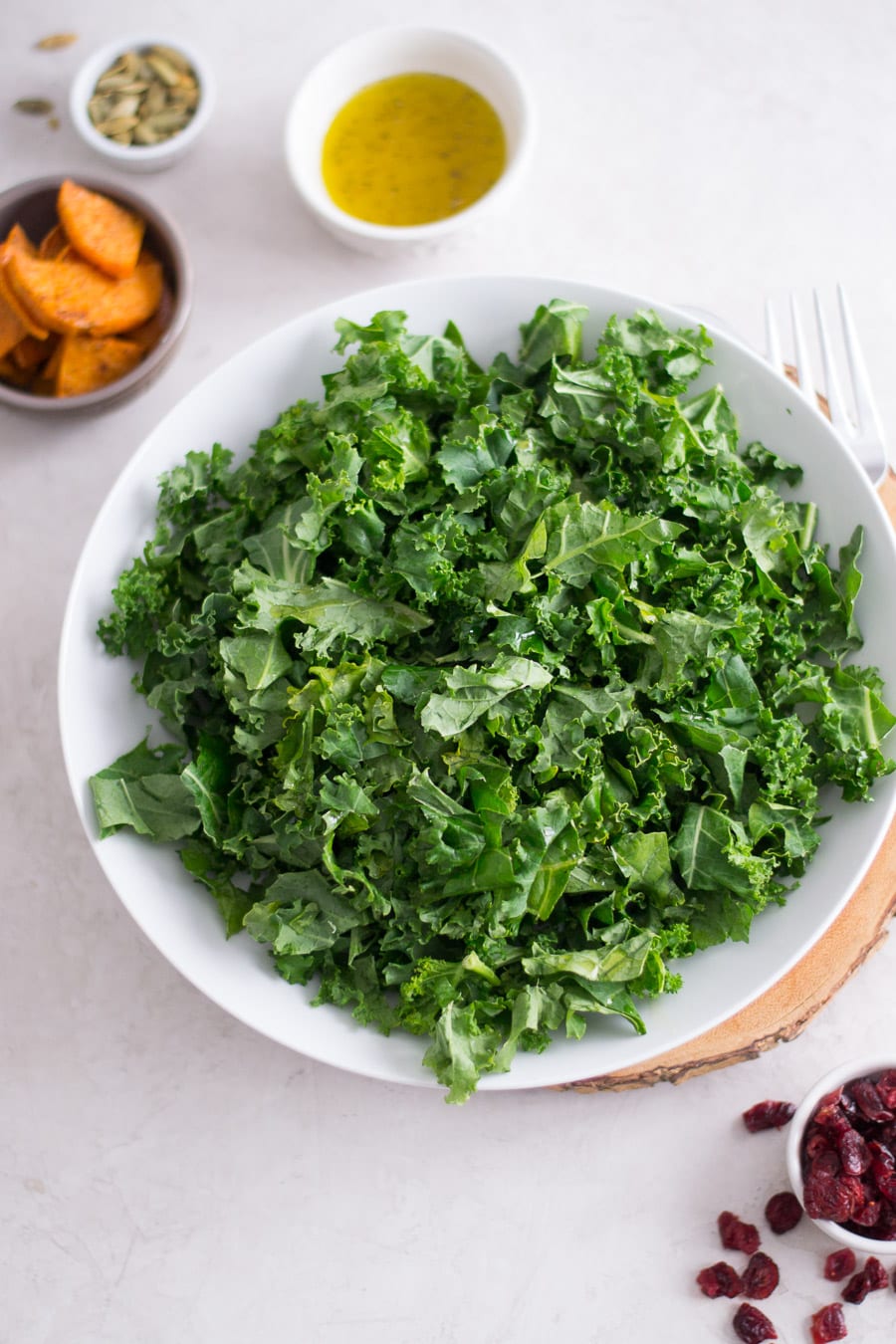 - Toss the kale with the pumpkin seeds and cranberries. Top with sweet potato slices and brie slices. Dress the salad with a little more vinaigrette and salt and pepper. Serve.