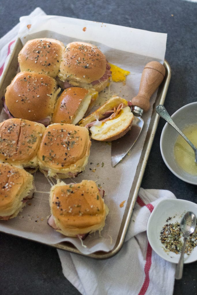 Inside-out croque madame sliders are filled with a spicy mustard cheese sauce, jammy eggs, and ham. It’s everything that is on a typical croque madame, just tucked perfectly inside.