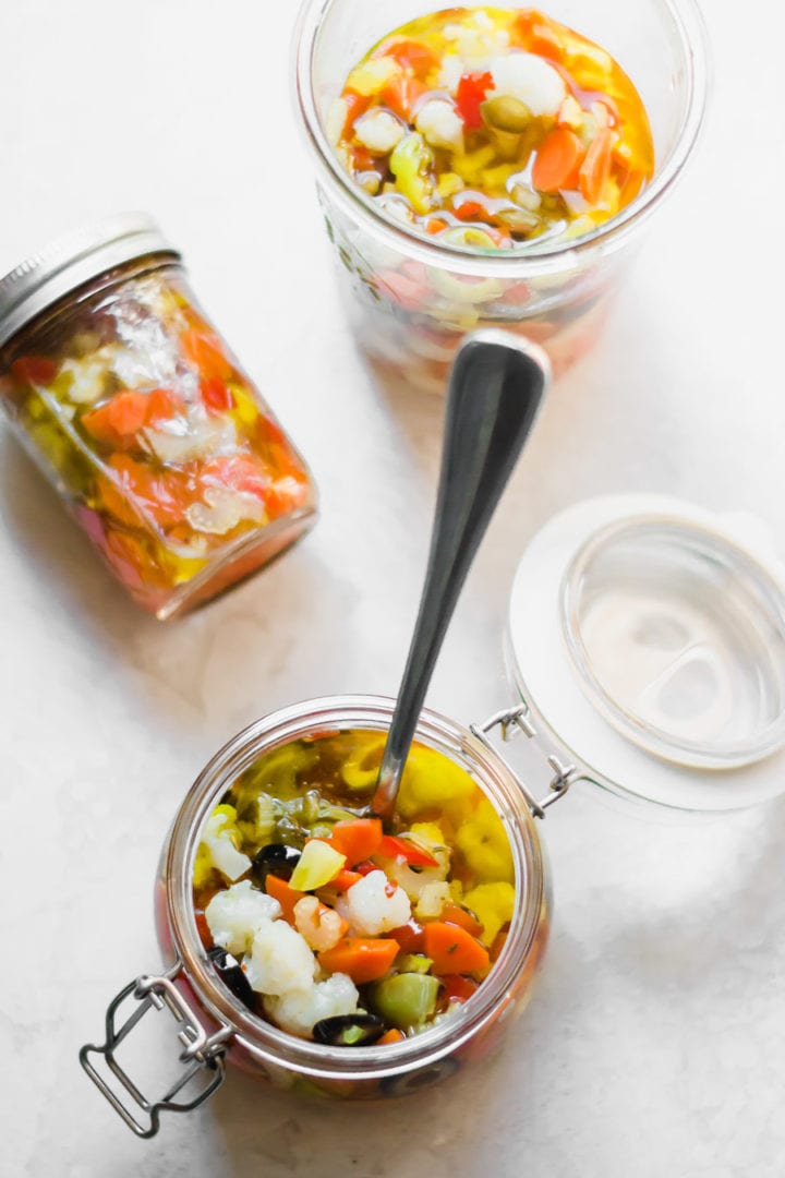 I used a mix of red bell pepper, cauliflower, celery, carrots, banana peppers, jalapeño peppers, black olives, and green olives.