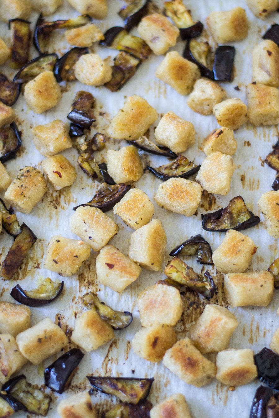 If you are using regular gnocchi, bake the eggplant alone for about 30 minutes, then add the gnocchi and bake for about 20 minutes until it is golden and crisp.