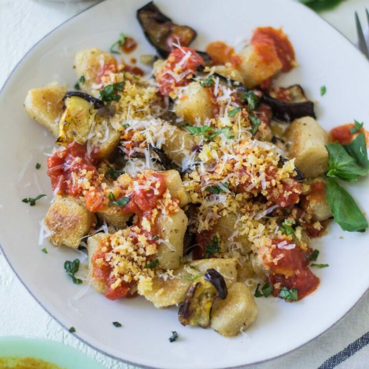 Crispy eggplant and cauliflower gnocchi baked on one sheet pan and then topped with garlic-butter breadcrumbs and parmesan cheese. IF USING REGULAR POTATO GNOCCHI THAT IS NOT FROZEN FOLLOW THESE STEPS! Drain the eggplant ahead of time just like the above instructions. Preheat the oven to 425 degrees F. Line a large baking sheet with parchment paper. Toss the drained eggplant with 1/2 the EVOO and half the crushed red pepper and oregano. Season with salt and pepper. Toss to combine. Bake the eggplant ALONE for 25-30 minutes. Remove eggplant from oven. Flip each piece over. Toss the gnocchi together in a bowl with the remaining oil, crushed red pepper, oregano, and a little pinch of salt. Add to the sheet pan. Bake for another 15 minutes. Remove and flip the gnocchi. Bake for 15 more minutes and everything should be toasted and crisp. Follow the above steps for the topping and serving instructions. As an Amazon Associate and member of other affiliate programs, I earn from qualifying purchases.