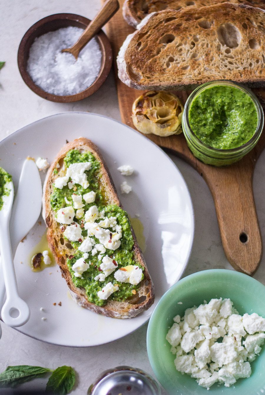 Pesto and Goat Cheese Garlic Bread is a meal in toast form. Roasted garlic spread over toasted bread with homemade pesto and crumbled goat cheese. A perfect party appetizer or fancy lunch.