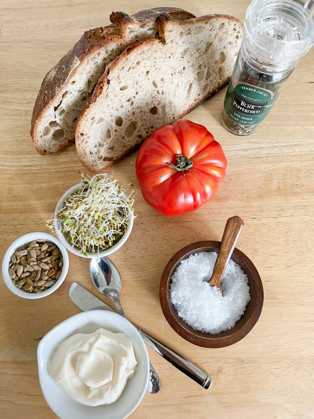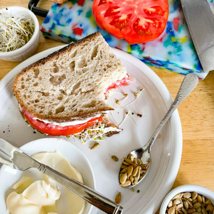 Sunflower seed and tomato sandwich has become my summer sandwich staple. It’s toasted bread, mayonnaise, roasted salted sunflower seeds, thick tomato slices, and sprouts. It is tart and bright. Everything you love about fresh summer tomatoes!