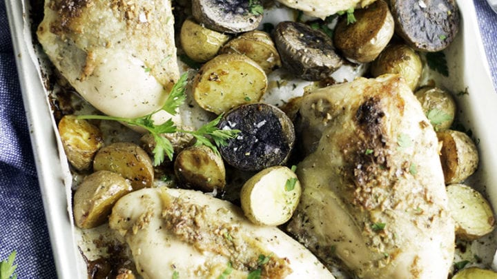 Boneless, skinless chicken breasts braised slowly with carrots, mushrooms, and onions in a red wine sauce.