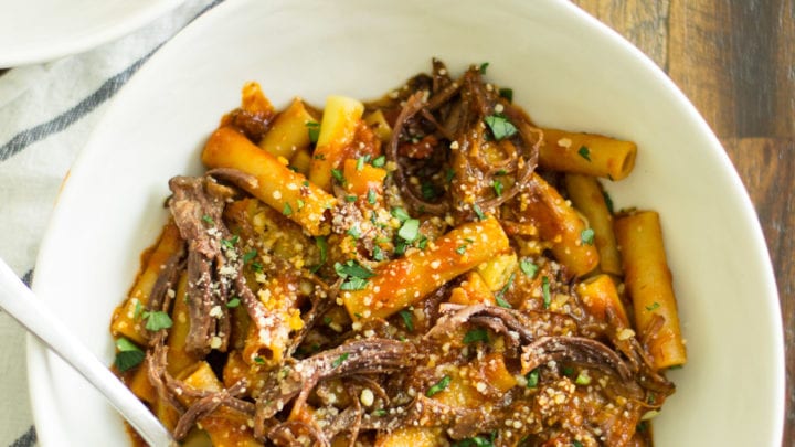Tender, fall-off-the-bone short ribs cooked in red wine and tomato sauce alongside ziti noodles.