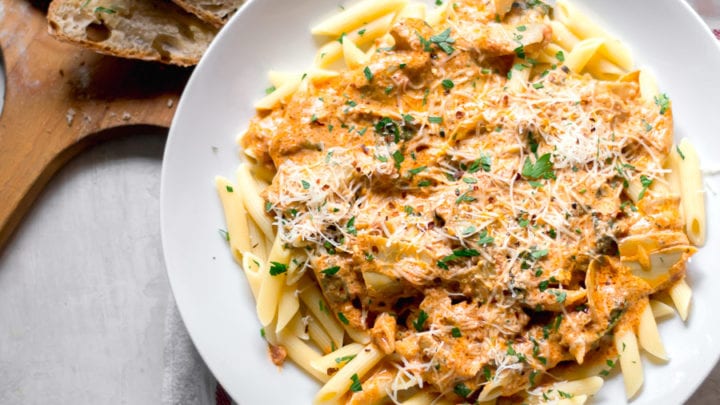 Buttery, spicy, and creamy spinach and artichoke loaded vodka sauce is perfect on any sort of pasta.