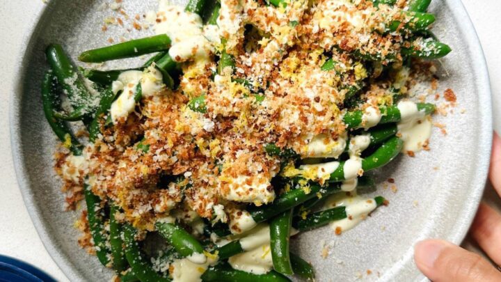 These Avocado Caesar Green Beans are some type of magic! Tender green beans, a zippy avocado caesar, and toasty panko all over top.